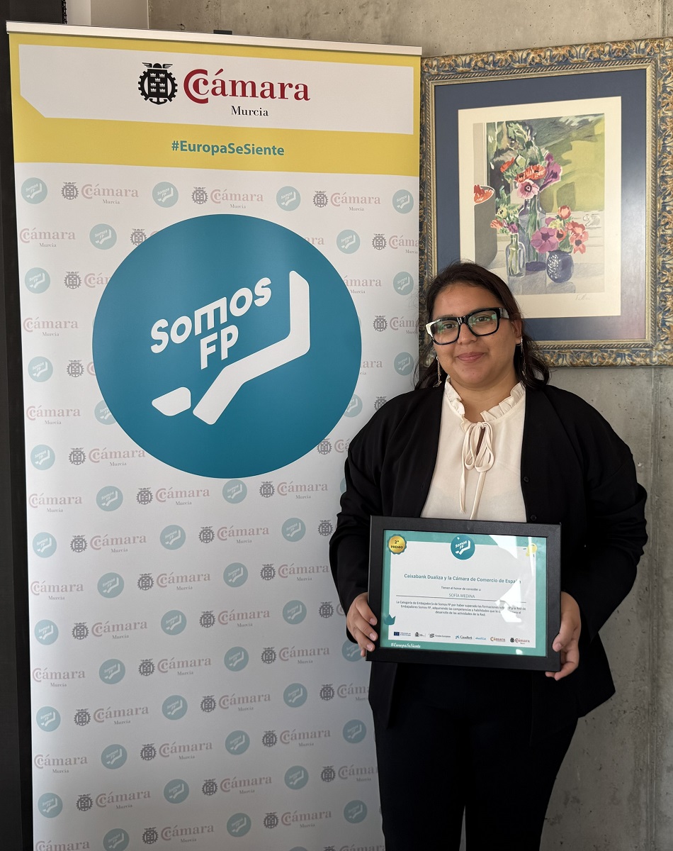 La Cámara de Comercio de Murcia ha elegido a la joven Ahinara Villaescusa Sánchez, Embajadora del Año en Murcia por su compromiso e implicación en la difusión entre otros jóvenes estudiantes de los beneficios de esta modalidad formativa. Es un reconocimiento que tiene lugar en el marco del Programa Somos FP, impulsado por la Cámara de Comercio de España y CaixaBank Dualiza, con el apoyo del Fondo Social Europeo.