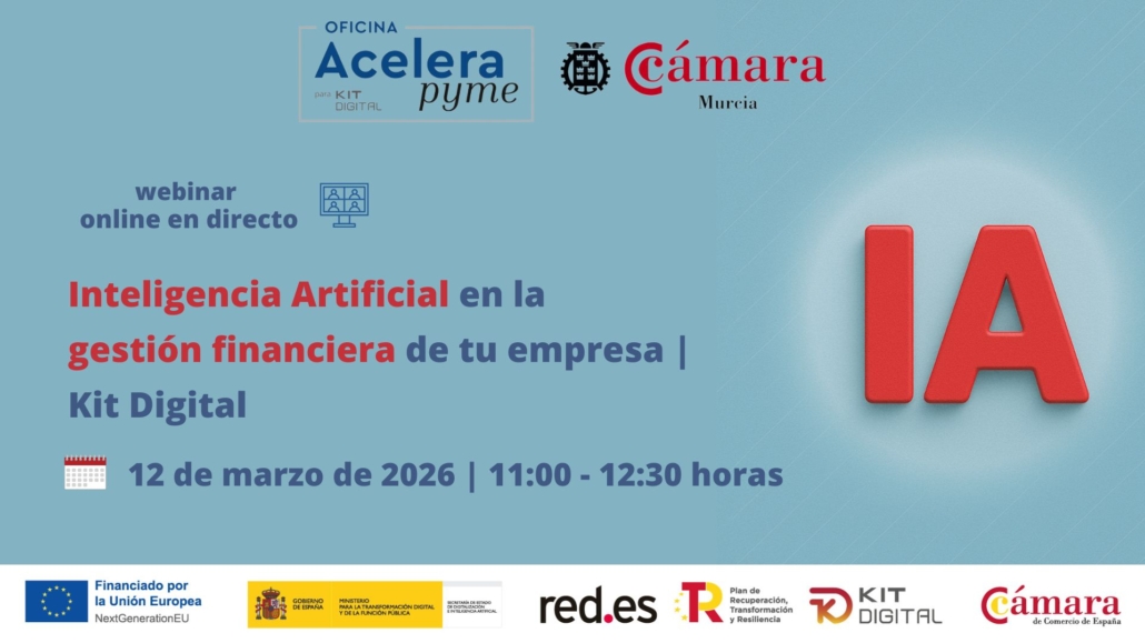 Este jueves 12 de marzo, la Cámara de Comercio de Murcia en el marco de la Oficina Acelera Pyme, te invita a este seminario donde conocerás cómo te puede ayudar la Inteligencia Artificial en la gestión financiera de tu empresa.